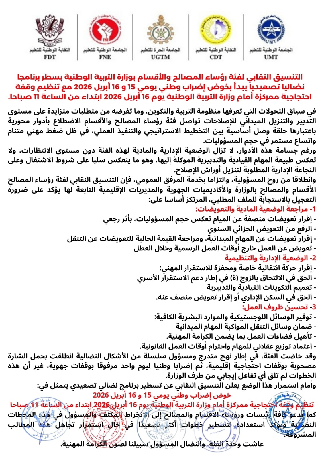 في خطوة نوعية تكسر منطق الصمت المؤسساتي، تستعد فئة رؤساء المصالح والأقسام بالمديريات الإقليمية والأكاديميات الجهوية للتربية والتكوين لخوض إضراب وطني يومي 15 و16 أبريل 2026، يتوج بوقفة احتجاجية مركزية حاشدة أمام مقر وزارة التربية الوطنية بالرباط، في مشهد يعكس احتقانا غير مسبوق داخل مفاصل الإدارة التربوية.